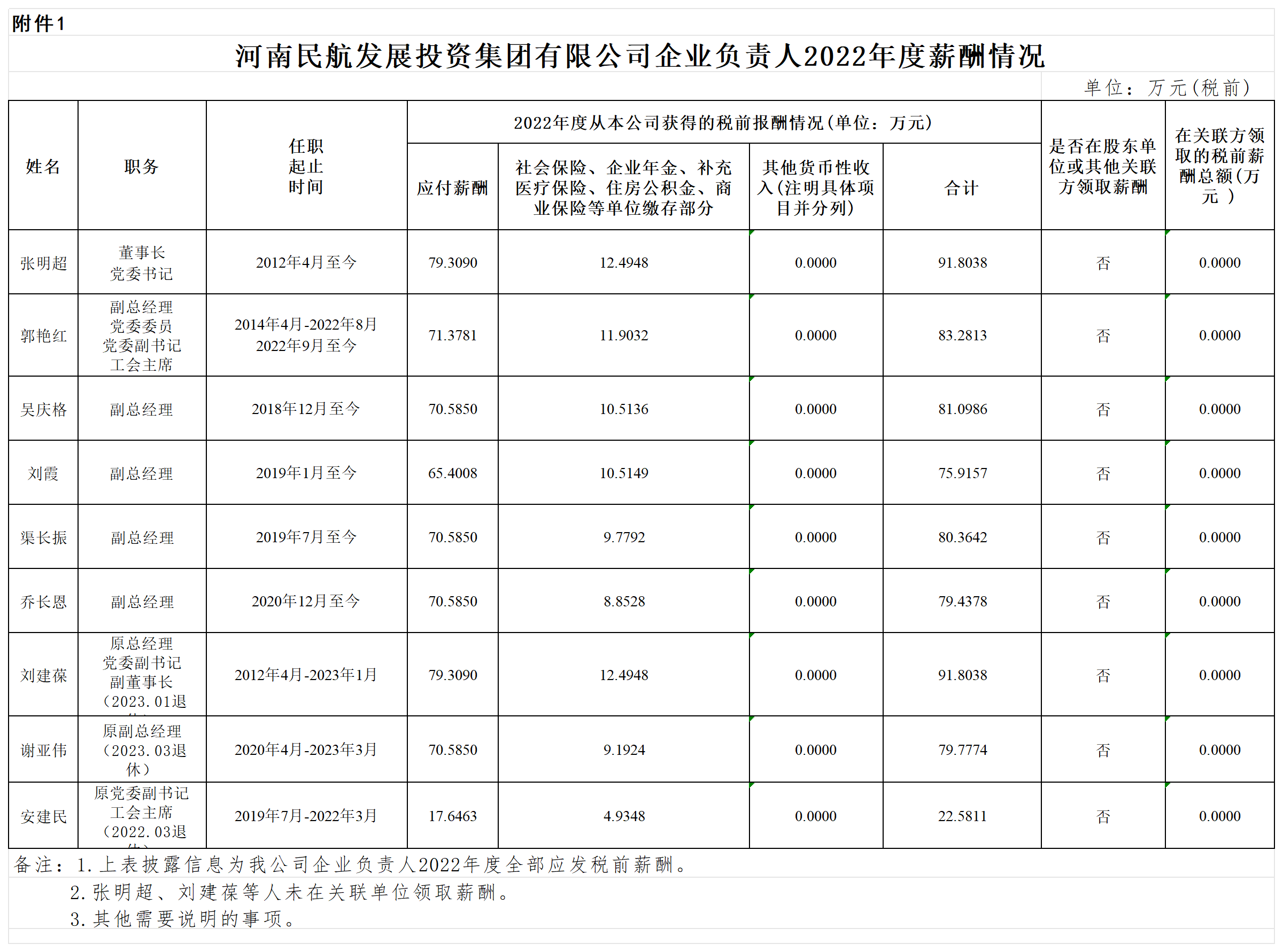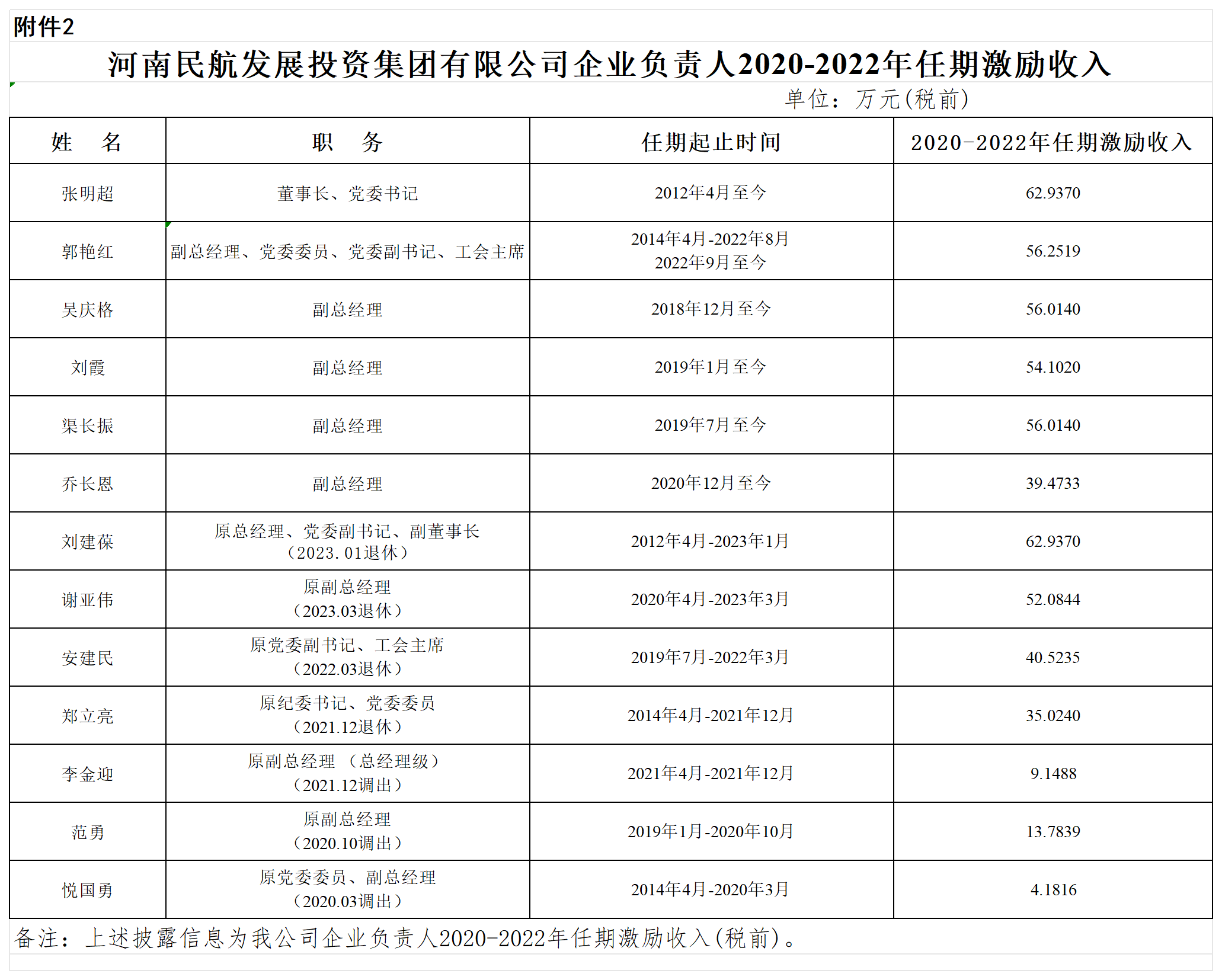 河南民航發(fā)展投資集團(tuán)有限公司企業(yè)負(fù)責(zé)人2022年度薪酬及2020-2022年任期激勵(lì)收入情況