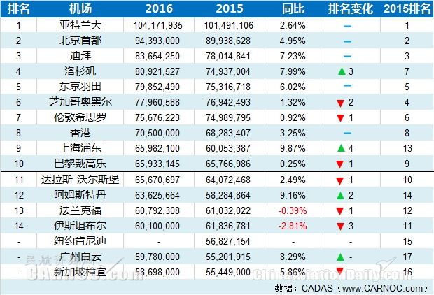 憑借其主要的中轉樞紐地位以及北美地區(qū)入境口岸的“戰(zhàn)略位置”,2016年亞特蘭大國際機場旅客吞吐量達到1.04億人次,同比增長2.64%。北京首都國際機場旅客吞吐量突破9000萬人次,達到了9439.3萬人次,同比增長約5%。迪拜國際機場繼續(xù)保持較高速的增長,發(fā)送旅客8365萬人次,保持第三。
