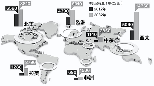 根據(jù)波音公司的預(yù)測,未來20年全球民機市場規(guī)模將翻一番,新興市場成為增長主動力。到2032年,全球?qū)⑿略龀^3.5萬架飛機,總額高達(dá)4.8萬億美元。亞太市場增幅最大,將新增1.282萬架飛機,總額1.89萬億美元。其中,中國市場發(fā)展最為迅速??湛凸究偛眉媸紫瘓?zhí)行官密法布里斯·布利葉認(rèn)為,中國航空業(yè)的迅速發(fā)展是中國經(jīng)濟(jì)社會發(fā)展的必然產(chǎn)物,中國航空業(yè)發(fā)展的年均增速約為10%,同期全球航空業(yè)的增速則為5%。在未來20年,中國將成為世界最大的航空市場。