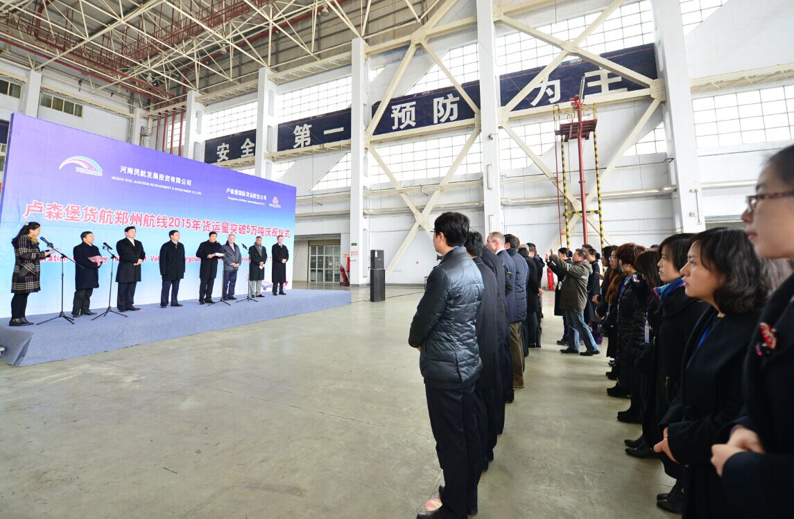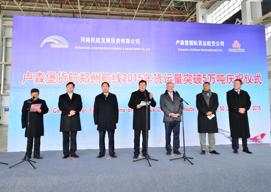 當(dāng)天中午,河南民航發(fā)展投資有限公司與盧貨航聯(lián)合在鄭州機(jī)場舉行了簡短熱烈的慶祝儀式。河南省副省長趙建才出席儀式并致辭,盧森堡駐華大使石泰嵋宣讀盧森堡可持續(xù)發(fā)展與基礎(chǔ)產(chǎn)業(yè)部部長弗朗索瓦?鮑施的賀信,省政府副秘書長張雷明主持儀式。省直單位有關(guān)負(fù)責(zé)人親臨現(xiàn)場。河南航投董事長、黨委書記張明超,總經(jīng)理、副董事長、黨委副書記劉建葆,公司領(lǐng)導(dǎo)悅國勇、鄭立亮、郭艷紅以及盧貨航董事會(huì)主席保羅?海明格、盧貨航總裁兼CEO德克?李奇同時(shí)參加儀式。