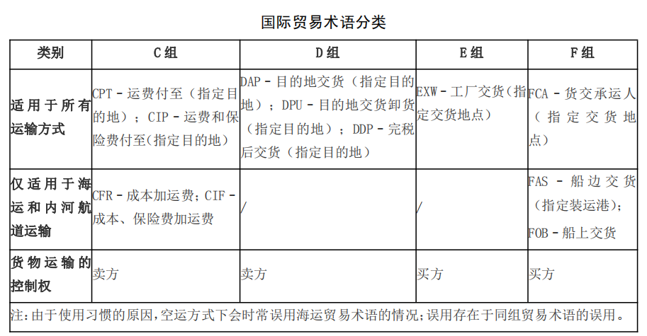 在國際貿(mào)易的貨物銷售合同中,進出口商使用國際商會《國際貿(mào)易術(shù)語解釋通則》(Incoterms),界定買賣雙方在風(fēng)險、成本、運輸和保險方面的義務(wù),避免誤解、爭議與因此導(dǎo)致的損失以及其他法律難題。根據(jù)最新的《國際貿(mào)易術(shù)語解釋通則》2020版,國際貿(mào)易術(shù)語共分成2類4組11個。