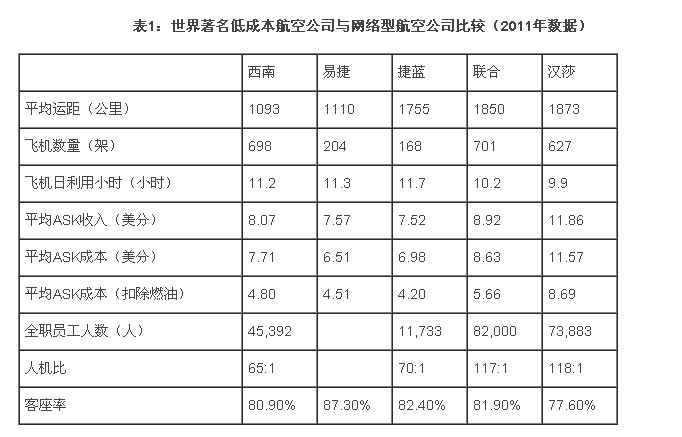 為了便于比較,本文選擇了我們普遍認可的低成本航空公司與較為熟悉的網(wǎng)絡(luò)型航空公司2011年的報表數(shù)據(jù),分別從平均運距、機隊規(guī)模、飛機日利用率、平均ASK收入與成本、以及客座率與人機比等項目進行比較(如表1)。